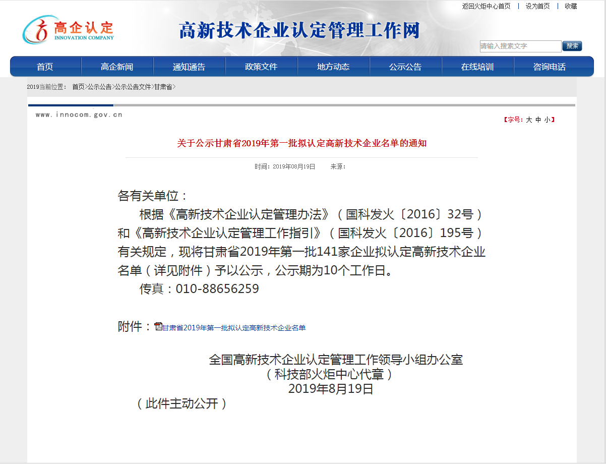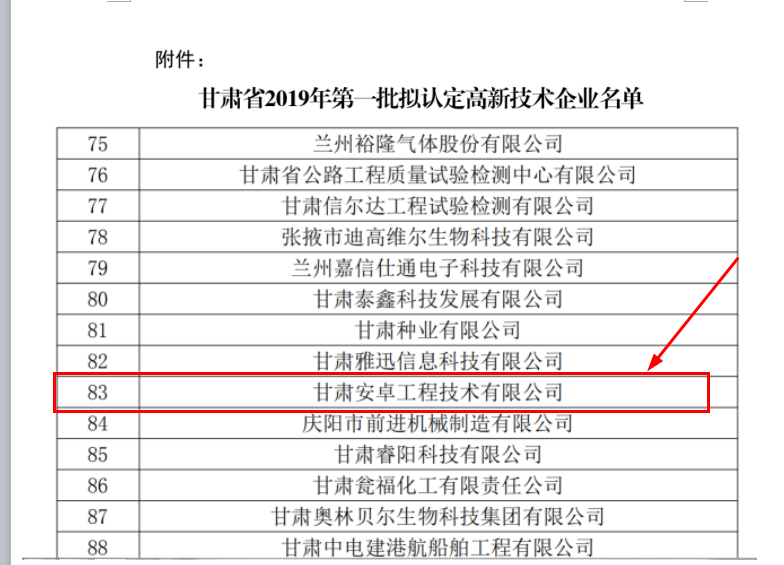 根據(jù)《高新技術(shù)企業(yè)認(rèn)定管理辦法》(國科發(fā)火〔2016〕32號(hào))和《高新技術(shù)企業(yè)認(rèn)定管理工作指引》(國科發(fā)火〔2016〕195號(hào))有關(guān)規(guī)定,經(jīng)公司申報(bào)、地方初審、專家審查等嚴(yán)格的申報(bào)程序,于2019年8月19日在“國家高新技術(shù)企業(yè)認(rèn)定工作網(wǎng)”上公示了“甘肅省2019年第一批擬認(rèn)定高新技術(shù)企業(yè)名單”甘肅安卓工程技術(shù)有限公司榜上有名。