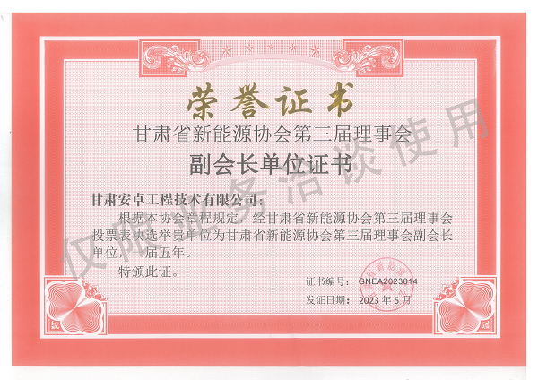 甘肅省新能源協(xié)會第三屆理事會副會長單位證書