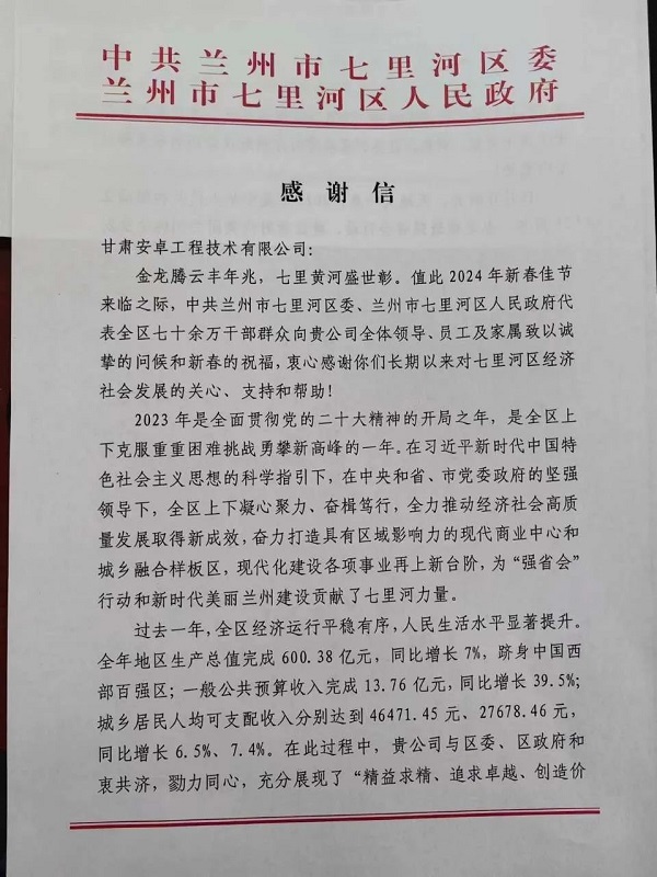 在這封充滿溫馨問候和新春祝福的感謝信中,中共蘭州市七里河區(qū)委與蘭州市七里河區(qū)人民政府對甘肅安卓過去一年的工作表示了認可與感謝。他們提到,甘肅安卓以“精益求精、追求卓越、創(chuàng)造價值”為準則,在推動全區(qū)改革發(fā)展方面默默付出,為區(qū)域經(jīng)濟社會的高質(zhì)量發(fā)展做出了自己的貢獻。同時,甘肅安卓的努力也為七里河區(qū)現(xiàn)代化建設(shè)各項事業(yè)的穩(wěn)步提升提供了助力。區(qū)委、區(qū)政府在信末送上了新年的美好祝愿,期望甘肅安卓未來繼續(xù)發(fā)揮引領(lǐng)作用,為七里河區(qū)乃至全市的繁榮與進步貢獻更多力量。