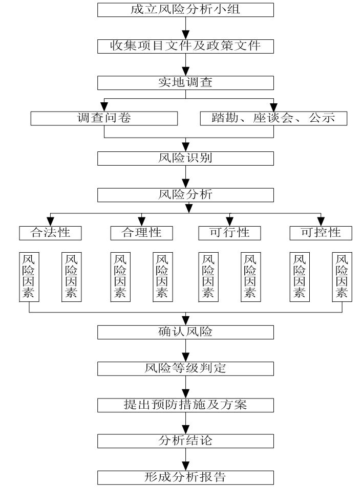 接到分析報(bào)告編制任務(wù)后,我公司成立了該項(xiàng)目的社會(huì)穩(wěn)定風(fēng)險(xiǎn)分析工作小組,并迅速組織開(kāi)展工作,其社會(huì)穩(wěn)定風(fēng)險(xiǎn)風(fēng)險(xiǎn)分析工作具體流程如下圖所示: