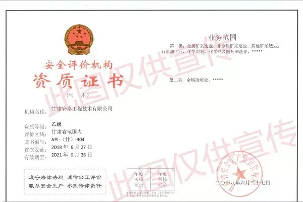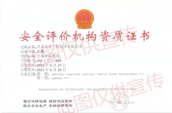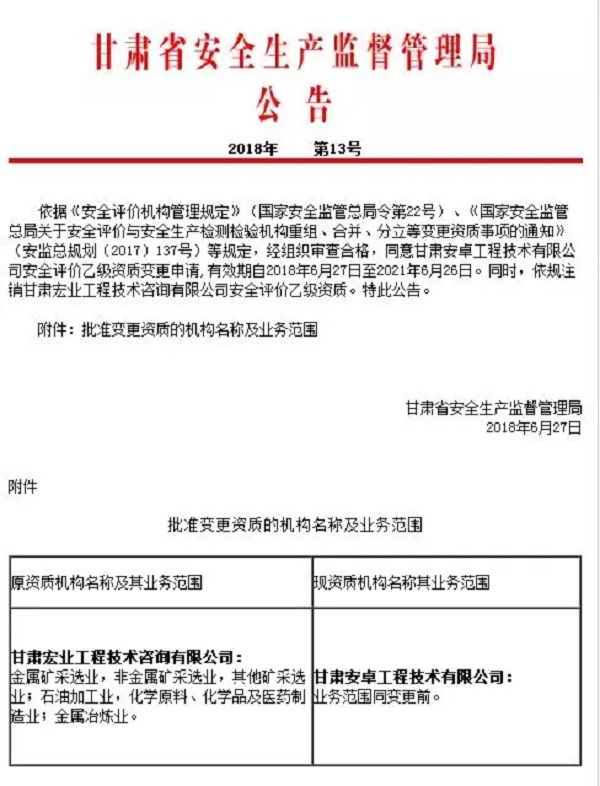 2018年6月27日,甘肅宏業(yè)工程技術(shù)咨詢有限公司安全評價(jià)機(jī)構(gòu)資質(zhì)已變更為甘肅安卓工程技術(shù)有限公司安全評價(jià)機(jī)構(gòu)資質(zhì),甘肅安卓工程有限公司成為甘肅省唯一同時(shí)具備安全評價(jià)資質(zhì)與消防檢測一級資質(zhì)的技術(shù)服務(wù)公司!